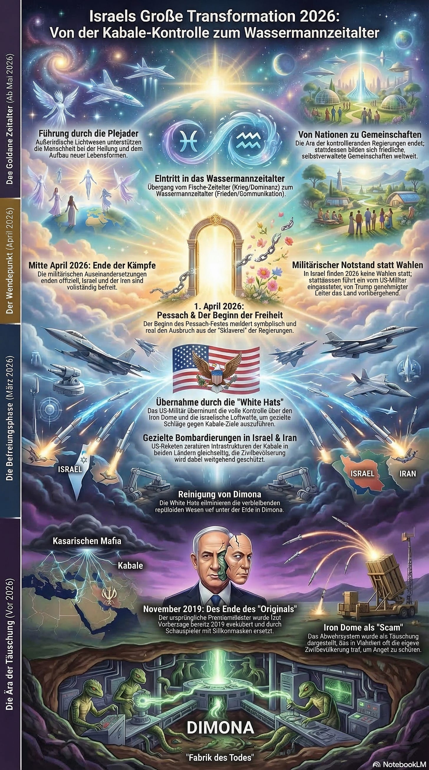 In dieser Sendung vom 16. März 2026 präsentiert die Seherin Gali Lucy spirituelle Vorhersagen für den März 2026, die den Nahen Osten und die globale Politik betreffen. Sie behauptet, dass das US-Militär und außerirdische Plejader die Kontrolle über Israel übernommen haben, um korrupte Strukturen zu zerschlagen. Laut ihren Channelings wurde Premierminister Netanjahu bereits vor Jahren durch Schauspieler ersetzt, während die israelische Armee entmachtet sei.